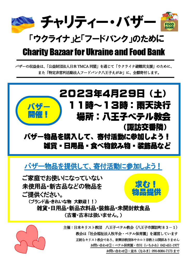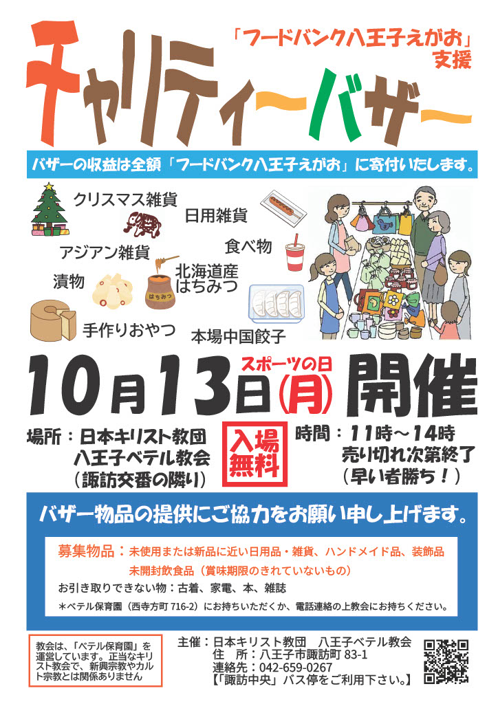 八王子ベテル教会は、このベテル保育園のキリスト教保育を支えると共に、保育園のある恩方地域や、近隣の元八王子地域といった八王子市北西部の地域にイエス・キリストの福音を宣べ伝えるために2012年11月に開設されました。