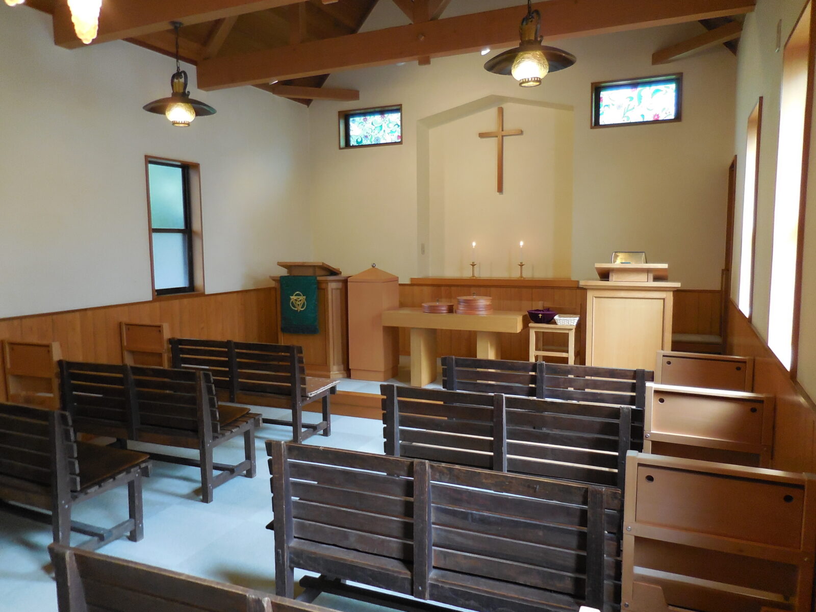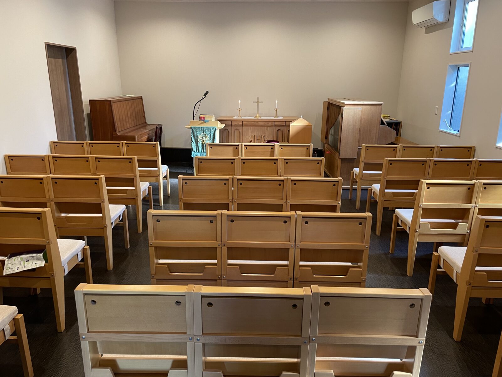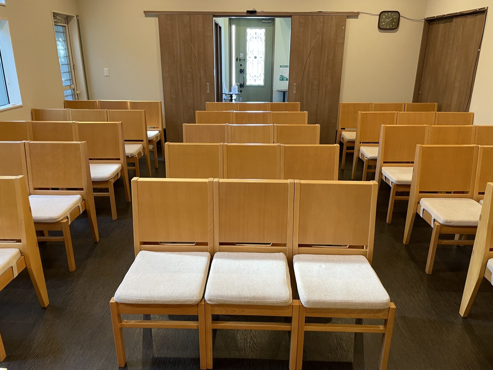 玄関を入って、まっすぐ正面に礼拝堂があります。40名ほどの座席があります。祭壇が正面に配置され、集まった皆さんは正面を向いて礼拝を行います。すべてフラットな作りになっています。