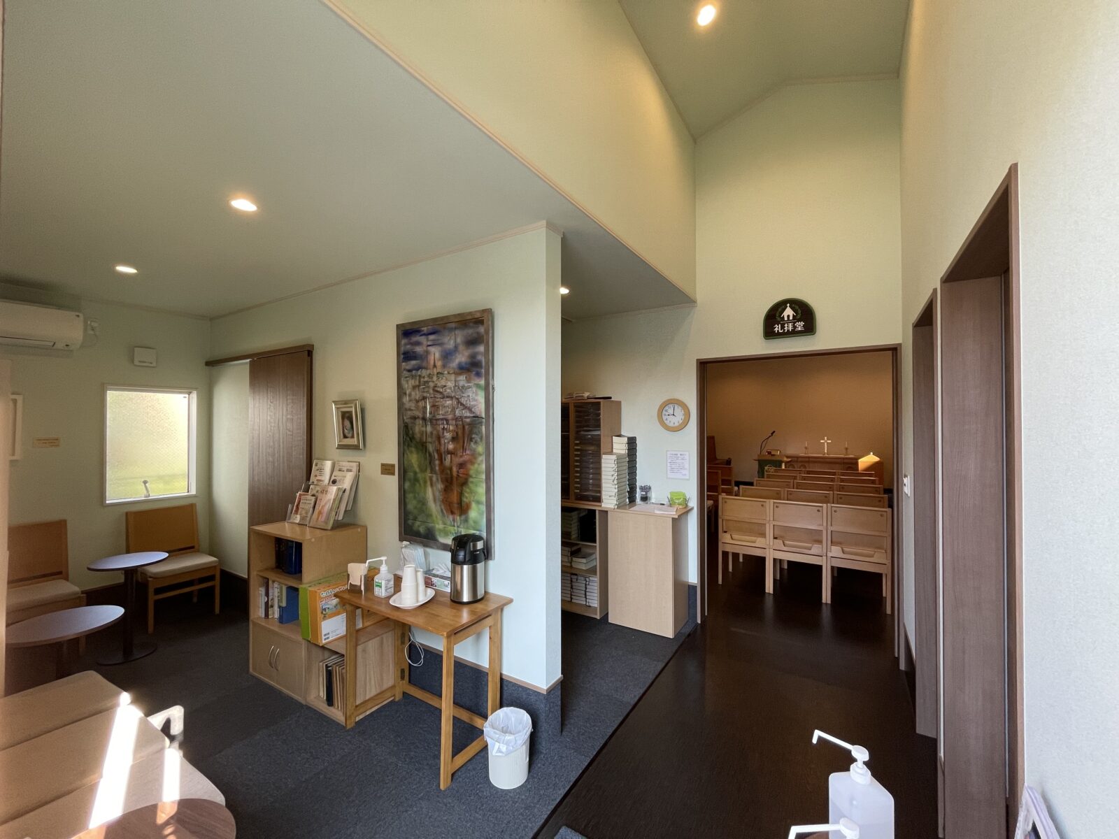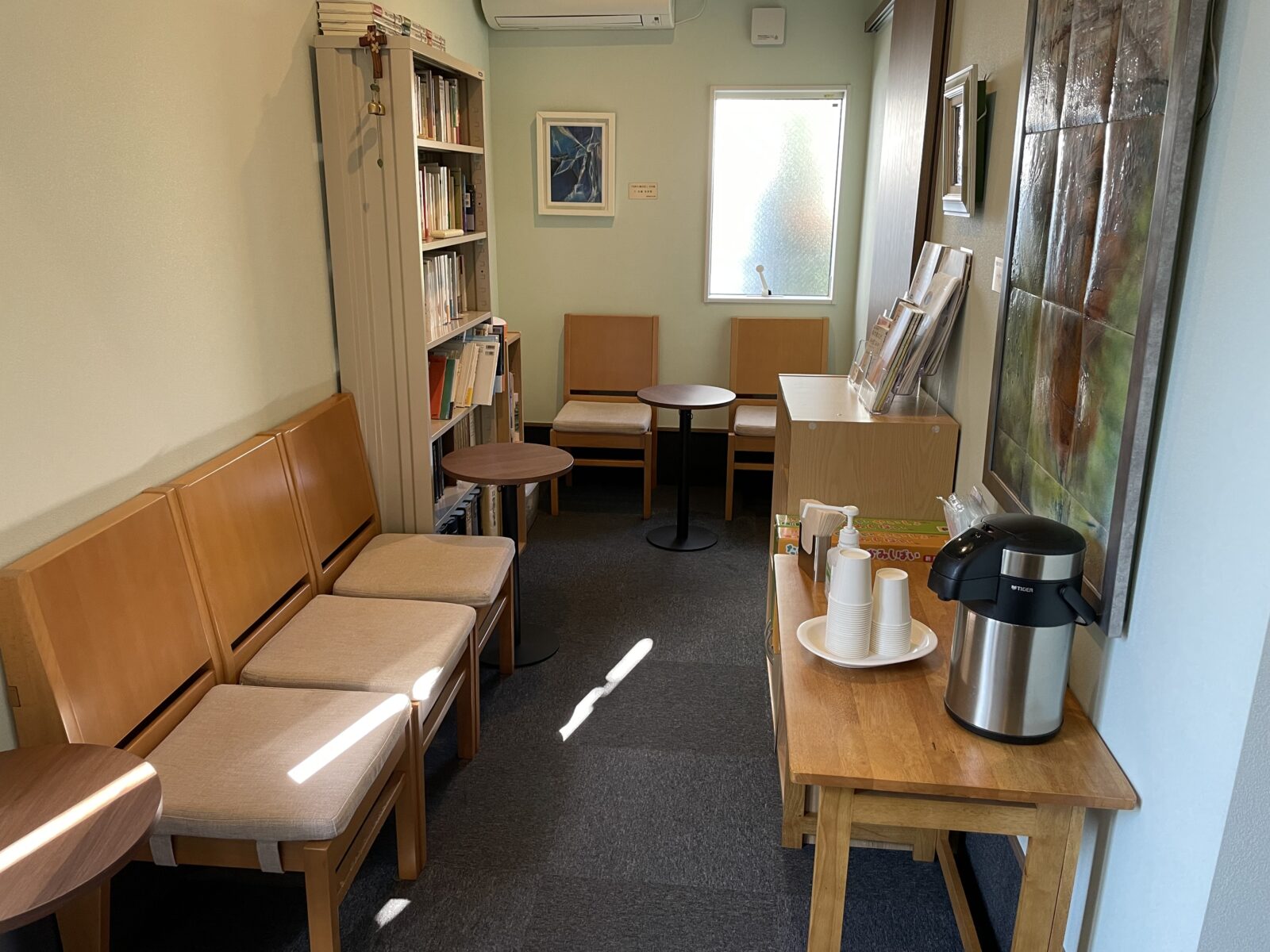 玄関を入ってすぐ左側に、椅子が置いてあり、お茶等も自由に飲めるスペースがあります。集会が始まる前や後に、少しお寛ぎになってください。
