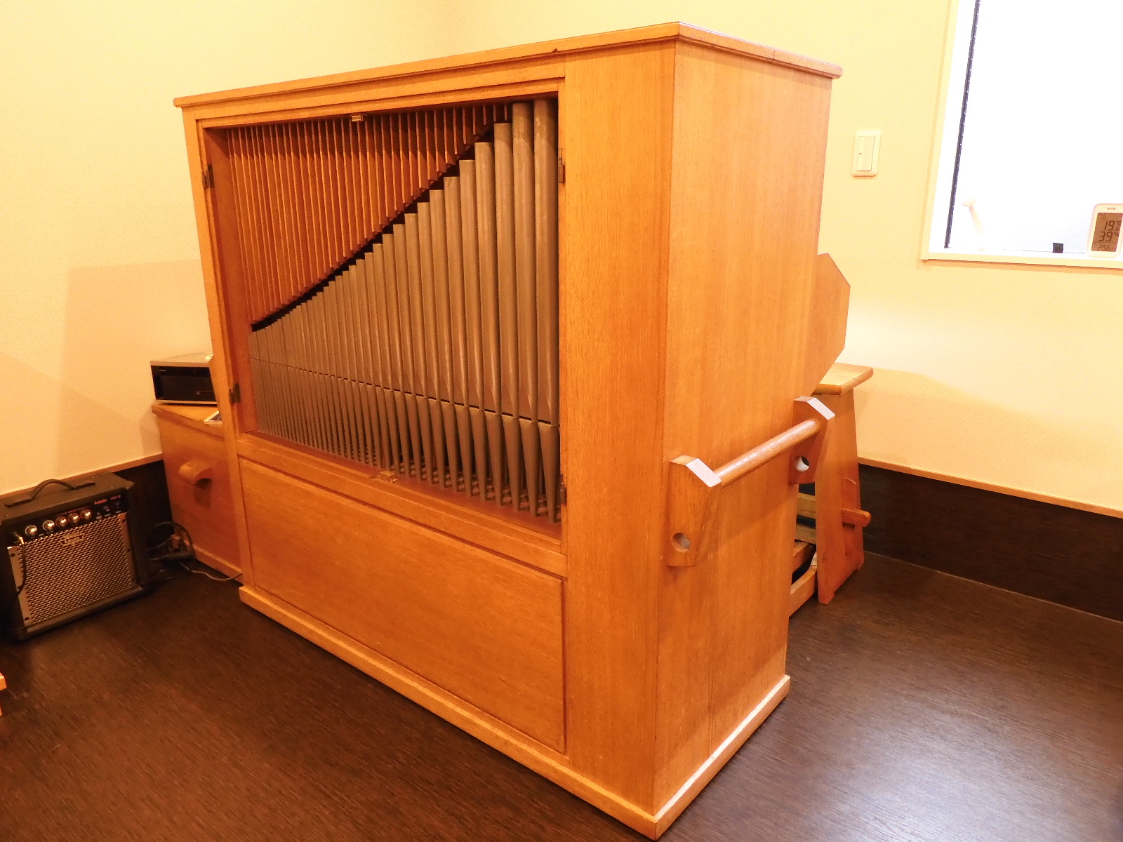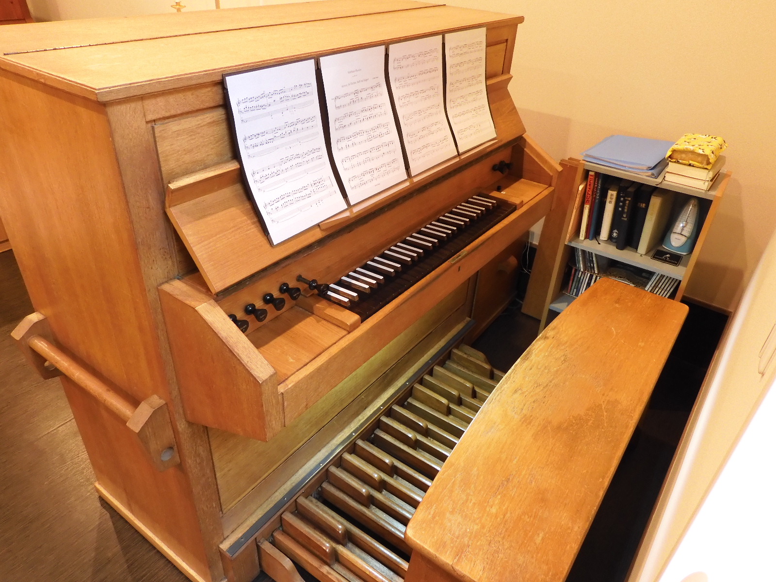 オルガンの他に、礼拝堂には、ビアノ(アップライト)も設置しており、礼拝の賛美を、ピアノで行う事もあります。