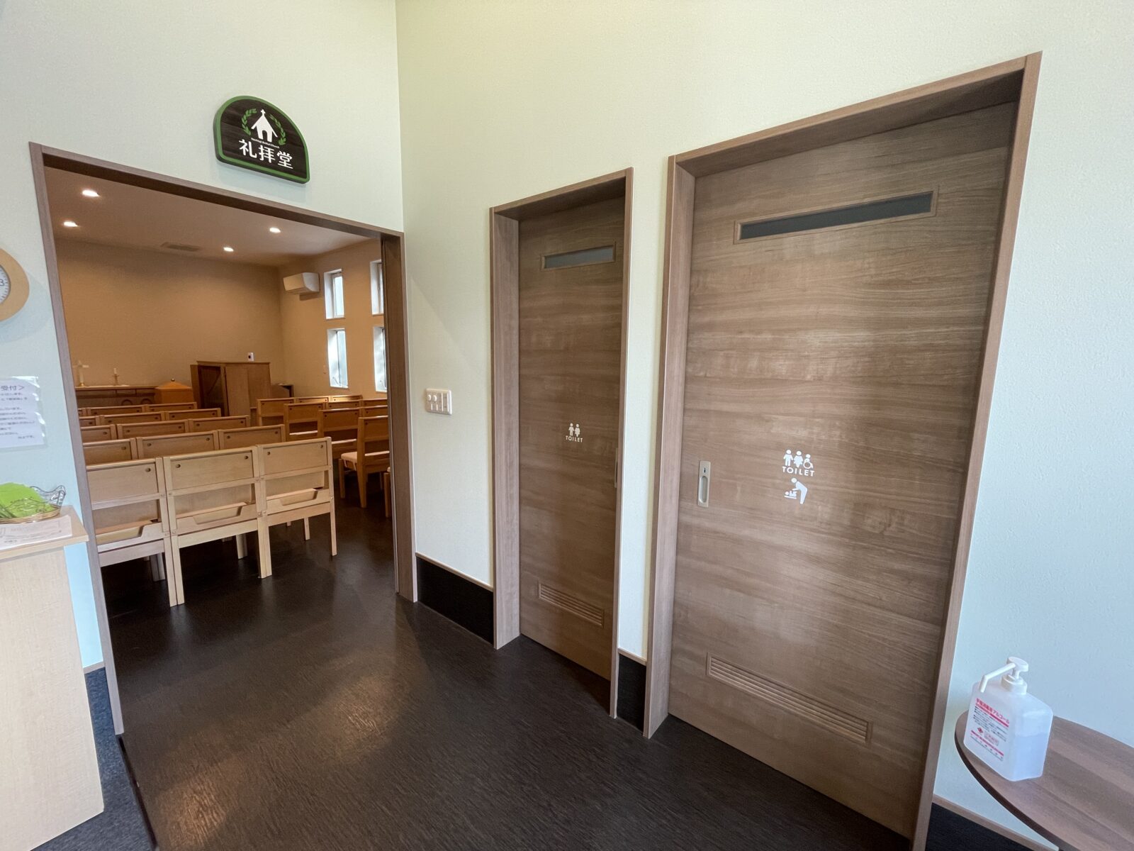 バリアフリー(ユニバーサルデザイン)として、教会は、駐車場から教会内すべて段差がなくフラットな作りになっています。また、車いす用のトイレ、オムツの交換台もあります。